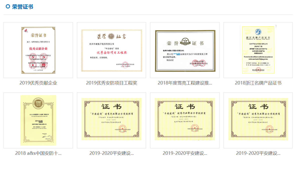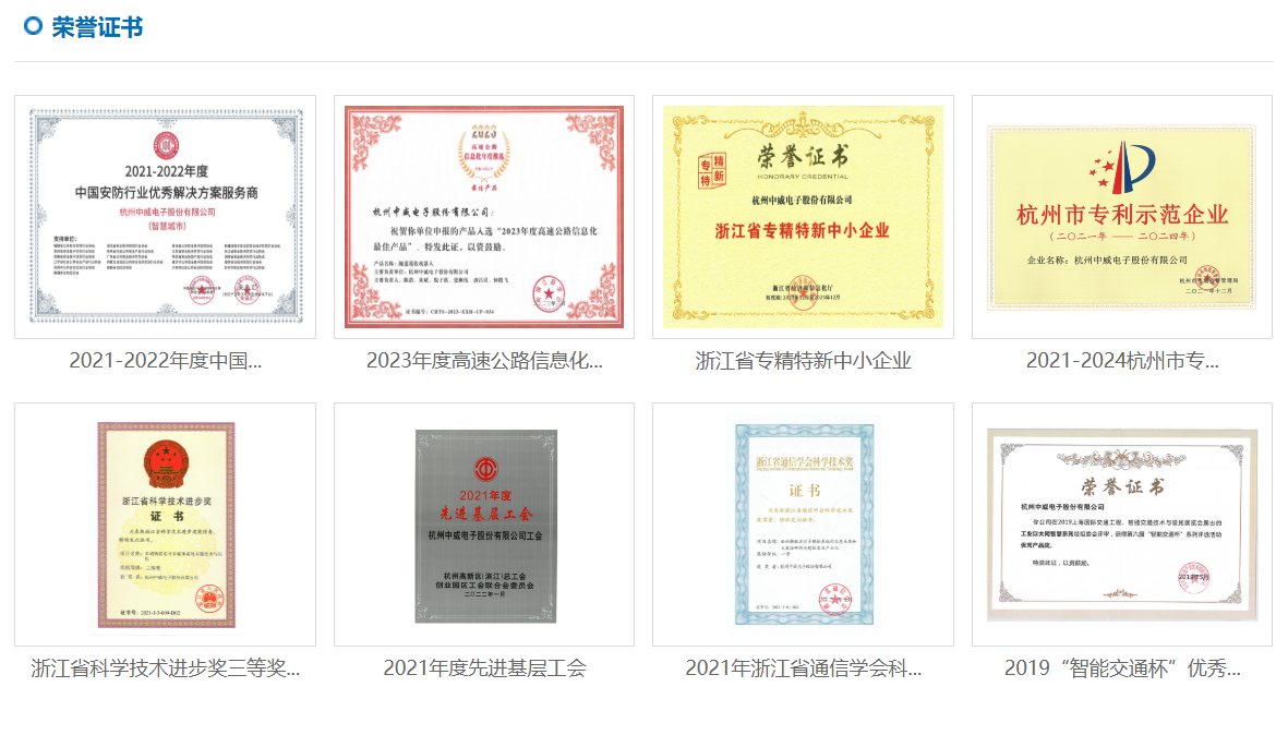 杭州中威电子股份有限公司(以下简称“中威电子”,股票代码300270),以“万物互联,让世界更安全”为使命,拥有视频结构化、视频云技术、大数据分析、物联网感知与传输等核心技术,定位于以AI视频应用为核心的行业物联网解决方案与运营服务提供商,依托于“中威云”AIoT视频云平台和视频中台能力,为智慧交通、智慧城市、智慧能源等行业提供标准化、可复制的系统解决方案。   中威电子以自主创新与技术合作相结合的原则,实行高起点、高品质的技术发展战略,是国家重点扶持高新技术企业,设有省级博士后流动工作站、浙江省重点企业研究院等多个研究机构,并在全国设立了19个直属销售服务中心、22个办事处。公司实力打造高清IP光传输系统、高清监控摄像机、智能事件检测设备、视频编解码系统、环境感知设备、视频云、物联感知综合管理系统平台以及报警系统、对讲系统、大屏显示系统、智慧停车、智慧灯杆、智慧服务区、巡检机器人等多样化产品体系,开拓车路协同、车联网等新领域,正在从安防产品和解决方案提供商走向人工智能/互联网/物联网相结合的安防运营与服务提供的新业态。   中威电子先后获得“优秀瞪羚企业”、“中国安防十大品牌”、“智能交通杯优秀产品”、“创新百强企业”、“智慧社区品牌”“浙江省通信学会科学技术一等奖”等荣誉称号。
